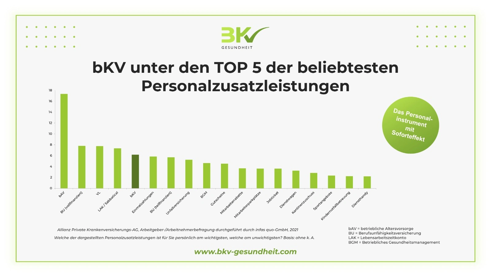 Die betriebliche Krankenversicherung gehört zu den 5 beliebtesten Personalzusatzleistungen in deutschen Unternehmen. Damit rangiert sie direkt hinter den Klassikern betriebliche Altersvorsorge (bAV), der Berufsunfähigkeitsversicherung (BU), Lebensarbeitszeitkonto (LAK) und Essenszuschuss.